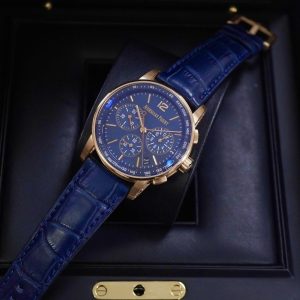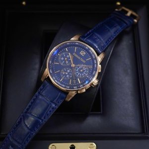 Mặt số màu xanh navy với họa tiết guilloché nổi bật ở trung tâm, kết hợp cùng các mặt phụ chronograph bố trí cân đối, giúp tăng tính thẩm mỹ và khả năng đọc thời gian. Cọc số và kim được thiết kế sắc nét, phủ dạ quang hỗ trợ quan sát trong điều kiện thiếu sáng.