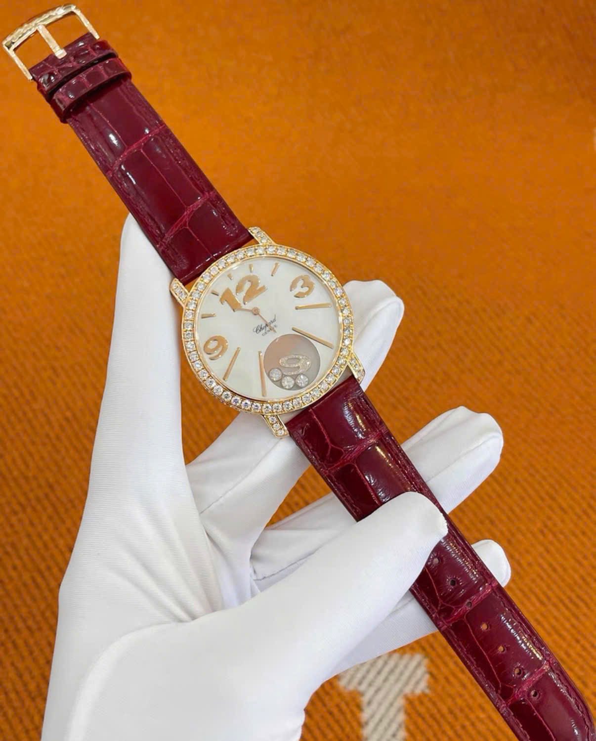 • Vỏ vàng hồng 18K sang trọng, đính kim cương tinh xảo
