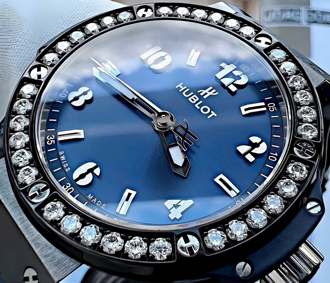 Hublot Big Bang Ceramic Blue Diamonds 38mm là mẫu đồng hồ nổi bật với sự kết hợp giữa thiết kế thể thao hiện đại và vẻ đẹp lấp lánh của kim cương.