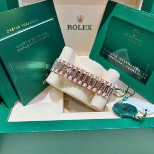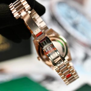 Vỏ và dây vàng hồng Everose 18K kết hợp cùng dây President biểu tượng giúp tổng thể vừa quyền lực vừa tinh tế. Thiết kế hiển thị thứ tại vị trí 12h và lịch ngày tại 3h là dấu ấn đặc trưng của dòng Day-Date.