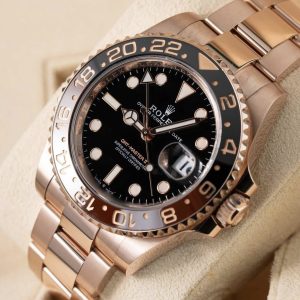 Mẫu đồng hồ sở hữu vỏ Everose Gold 18k nguyên khối, mang lại sắc hồng ấm áp và giá trị cao cấp. Vành bezel Cerachrom hai màu đen – nâu đặc trưng không chỉ tạo nên dấu ấn thẩm mỹ độc đáo mà còn giúp hiển thị múi giờ thứ hai một cách rõ ràng và trực quan.