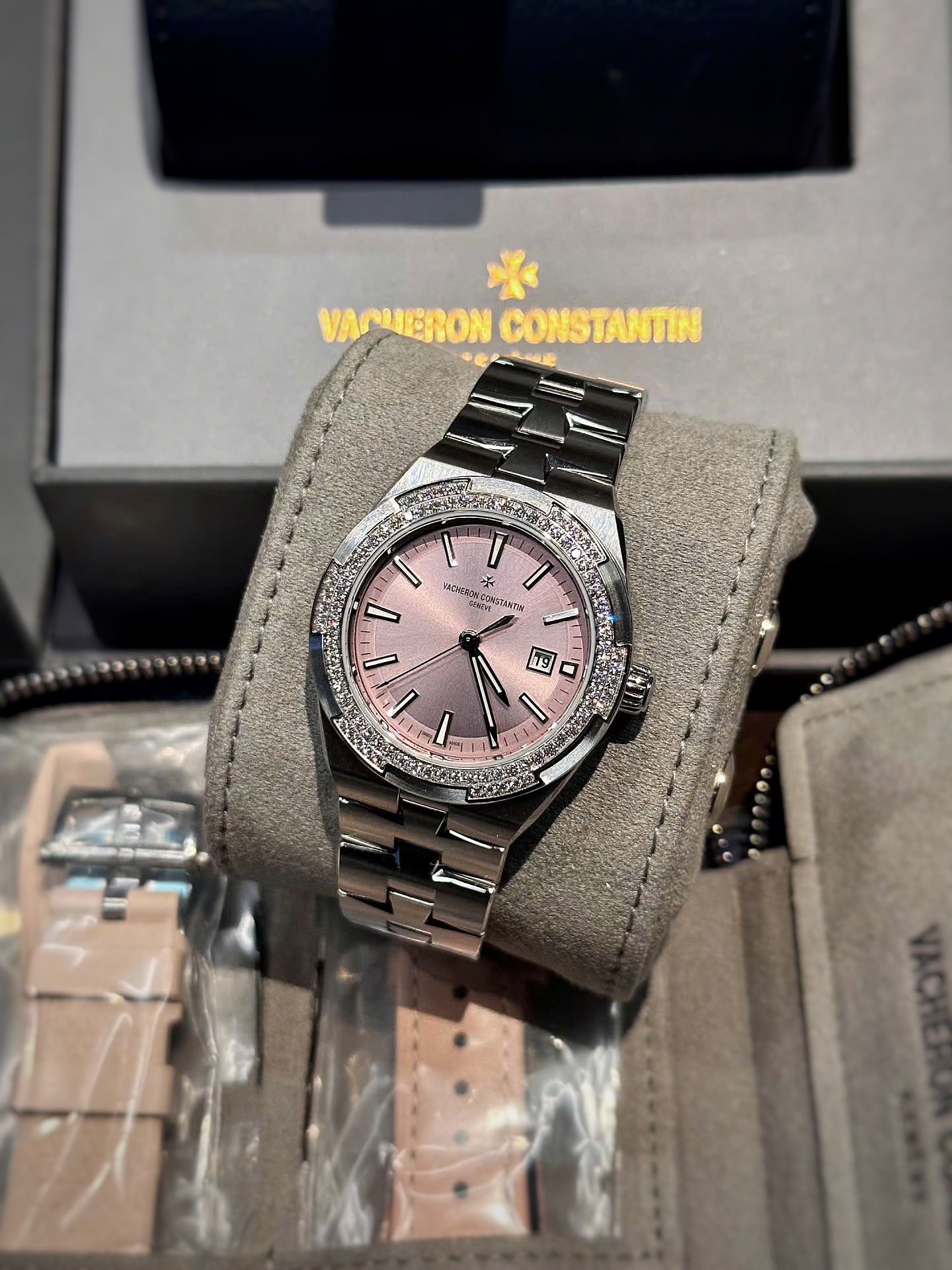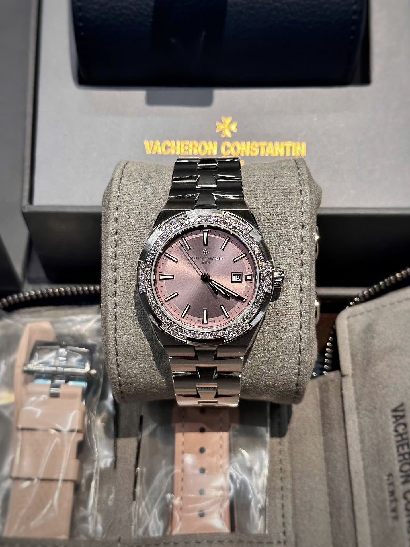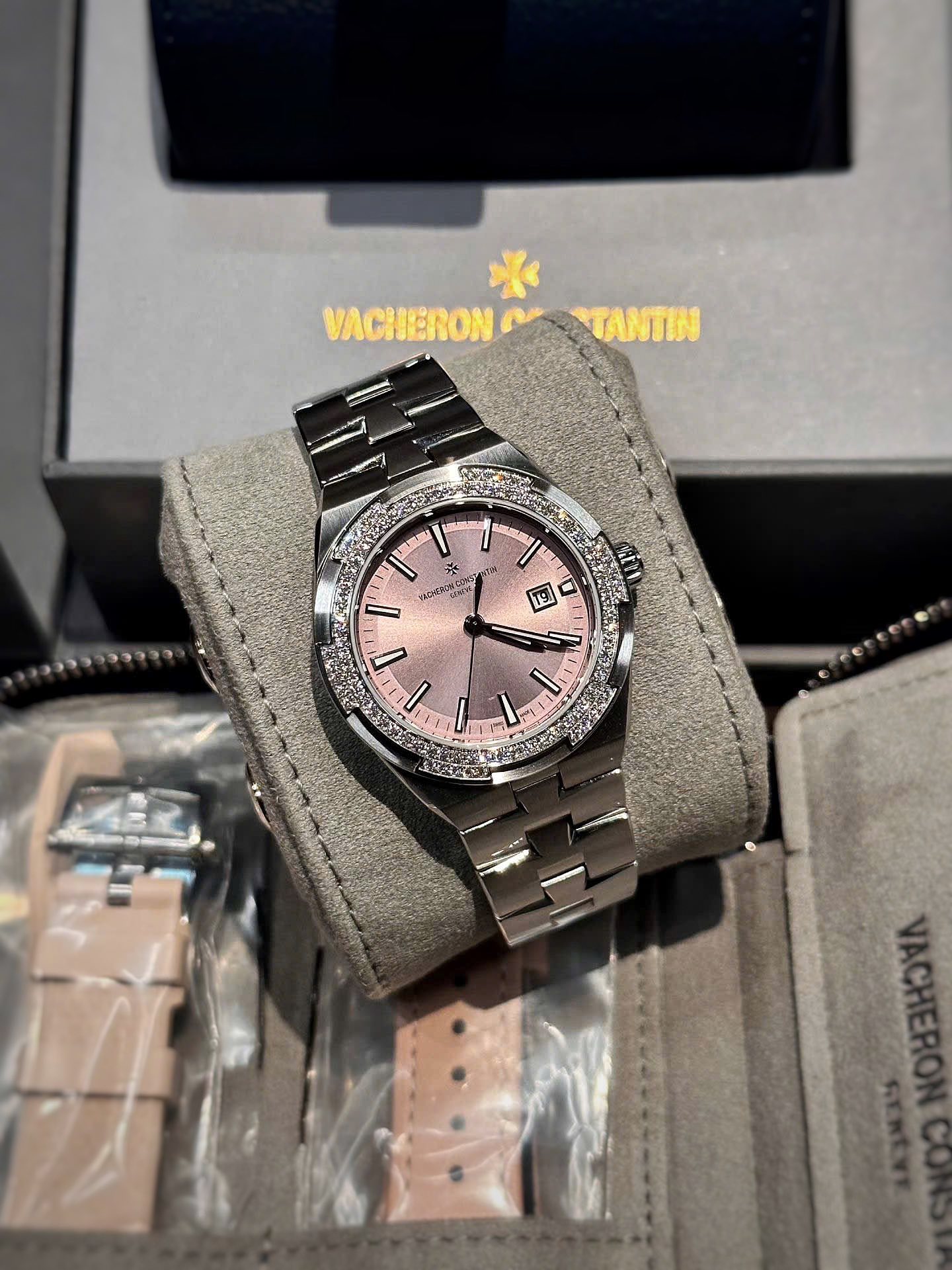 Sở hữu thiết kế tinh tế cùng sắc hồng thanh lịch, VC Overseas 4605/200A-B971 Pink là biểu tượng của phong cách nữ tính hiện đại. Mẫu đồng hồ nổi bật với mặt số hồng sunburst cuốn hút, kết hợp cùng viền đính kim cương sang trọng, giúp tôn lên vẻ đẹp quý phái trên cổ tay.